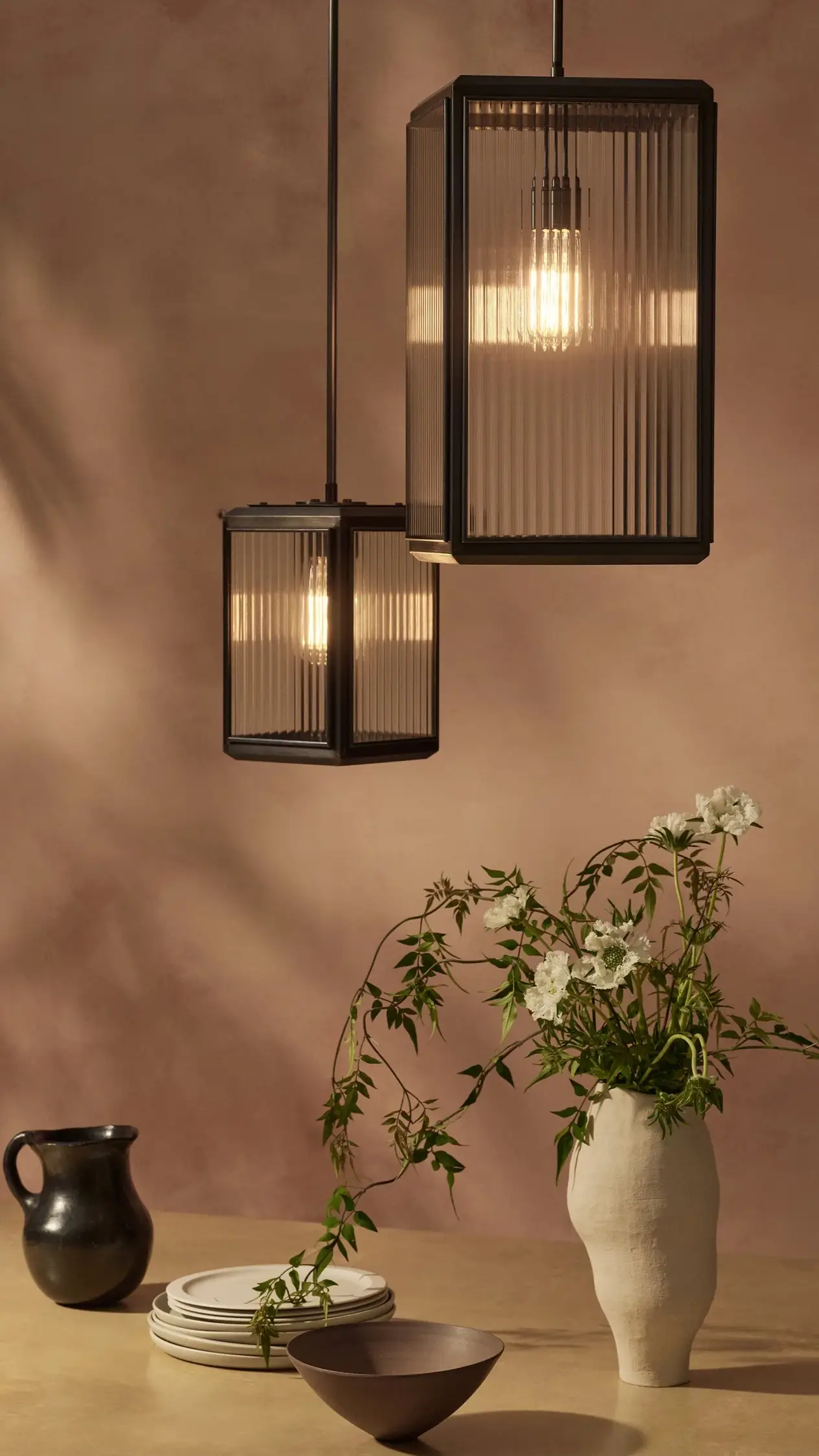 J. Adams leker med materialet og skjønnheten i lyset gjennom rilleglass. Dette gir Strata et fantastisk blikkfang. Hver lampe er produsert med presisjonsskåret glass og konstruert solid messing.