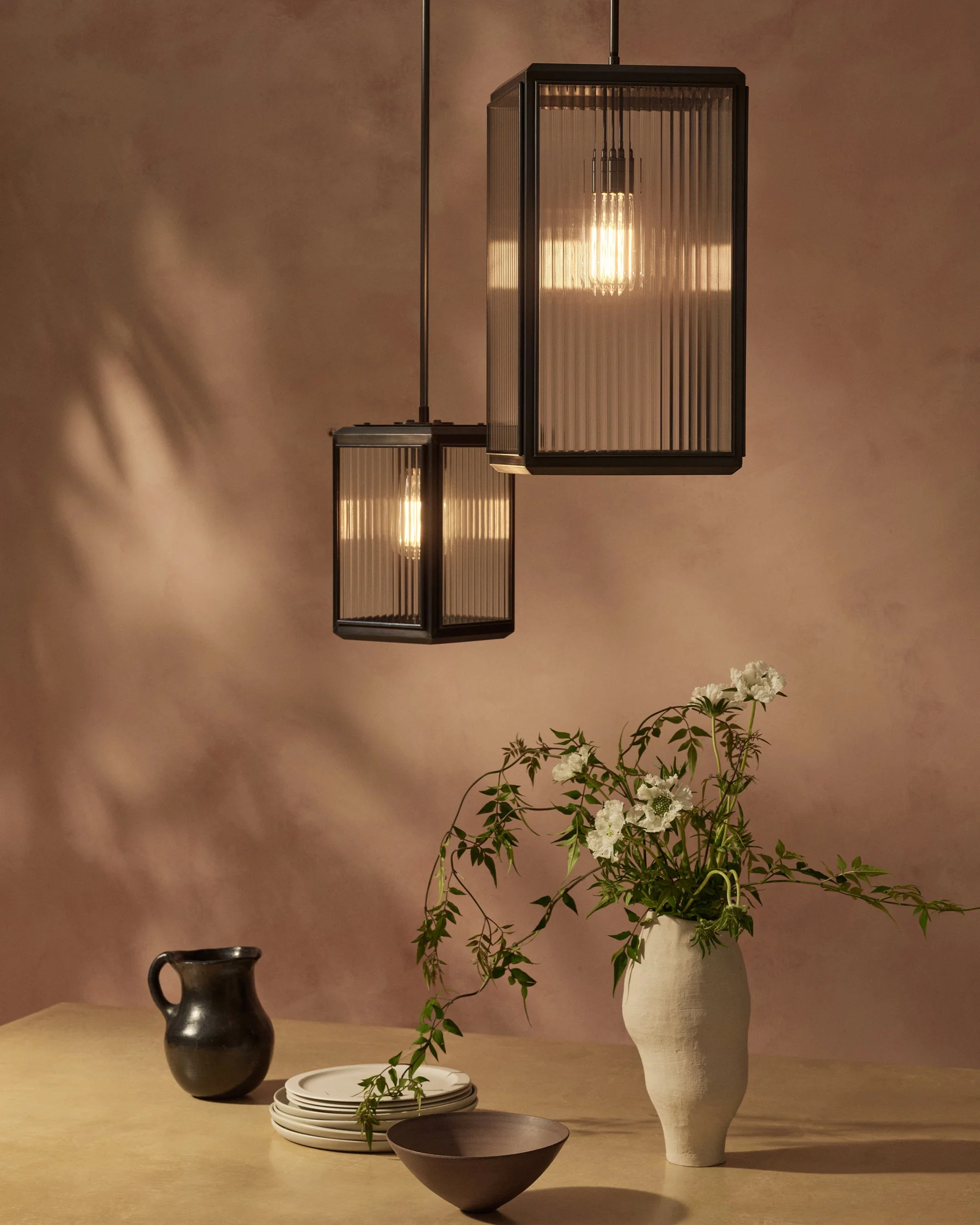 A classic lantern form rendered in bronze or antique brass, the Lilac Tall Pendant is available with clear or reeded glass to modulate its glow from crisp and open to softly diffused.