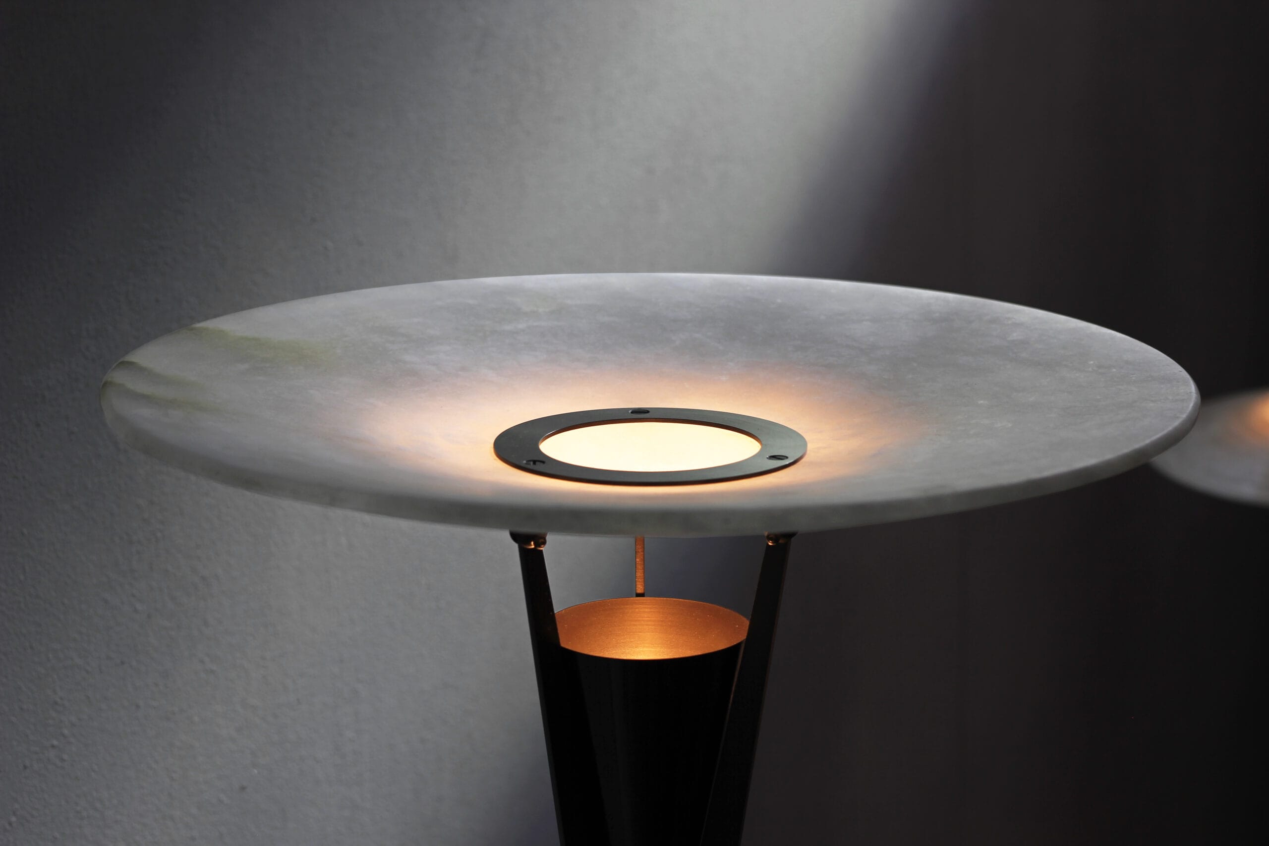Sourced from its namesake region of Spain, Aragon explores the translucent and reflective properties of alabaster stone. Playing with texture and light, in material and illumination; the opalescent, sculptural stone is in contrast to its lustrous, machined brass body with the conical stepped shade designed to both reflect and diffuse light.