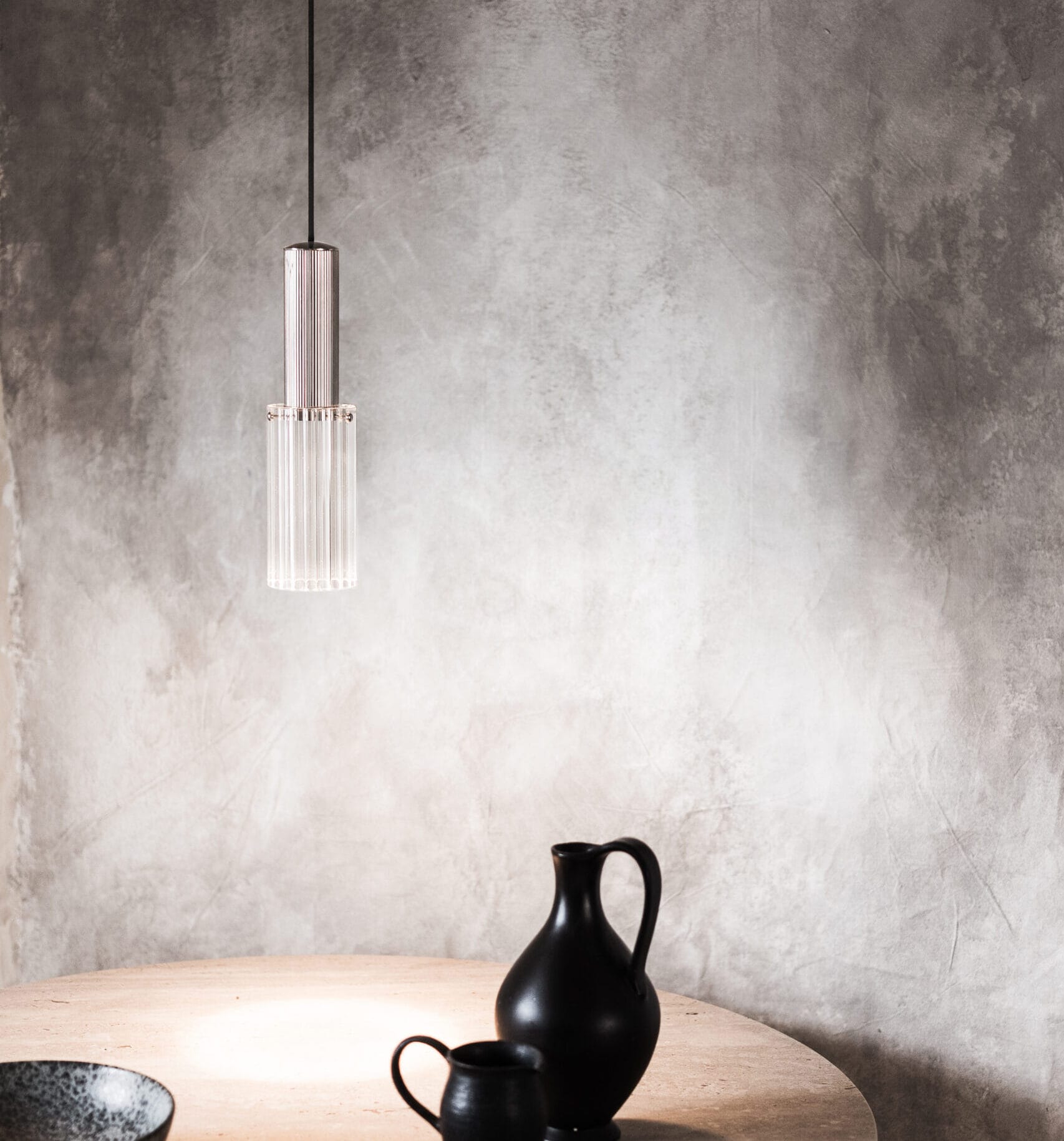 The Flume 80 Pendant features a wider (80mm) reeded glass shade, altering the proportions of the illumination. Casting a larger pool of focused light, while also offering a warm, intimate ambience, Flume 80 is perfect for use over counter tops, bars and even dining tables.