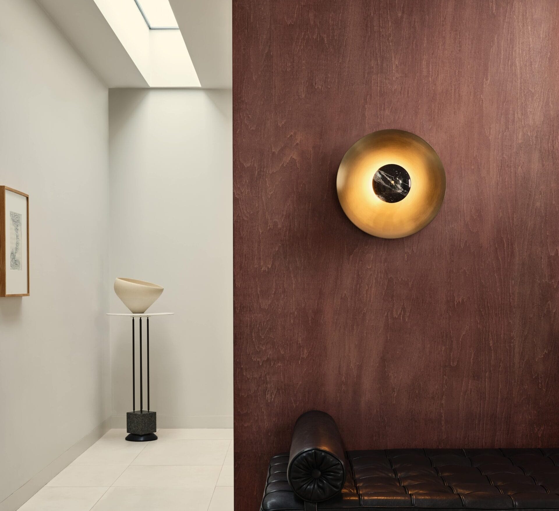 Exploring concealed light and reflected illumination, Luna takes inspiration from the cosmos, mimicking the effect of a total eclipse by using handmade travertine or black marble discs to obscure its LED light source.