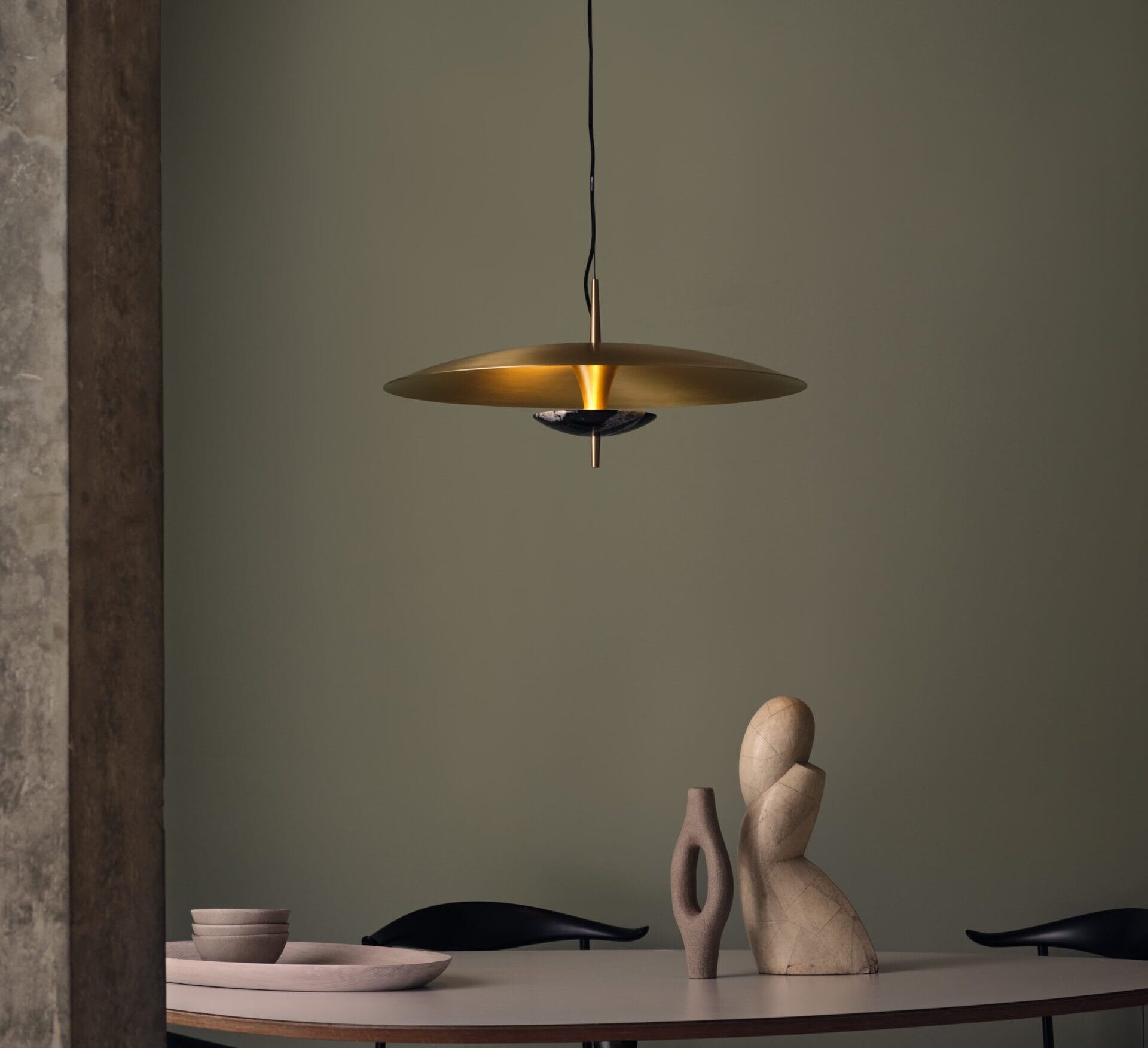 Reflected by a large hand-spun brass disc, an outward halo of warm and inviting indirect light is cast.
