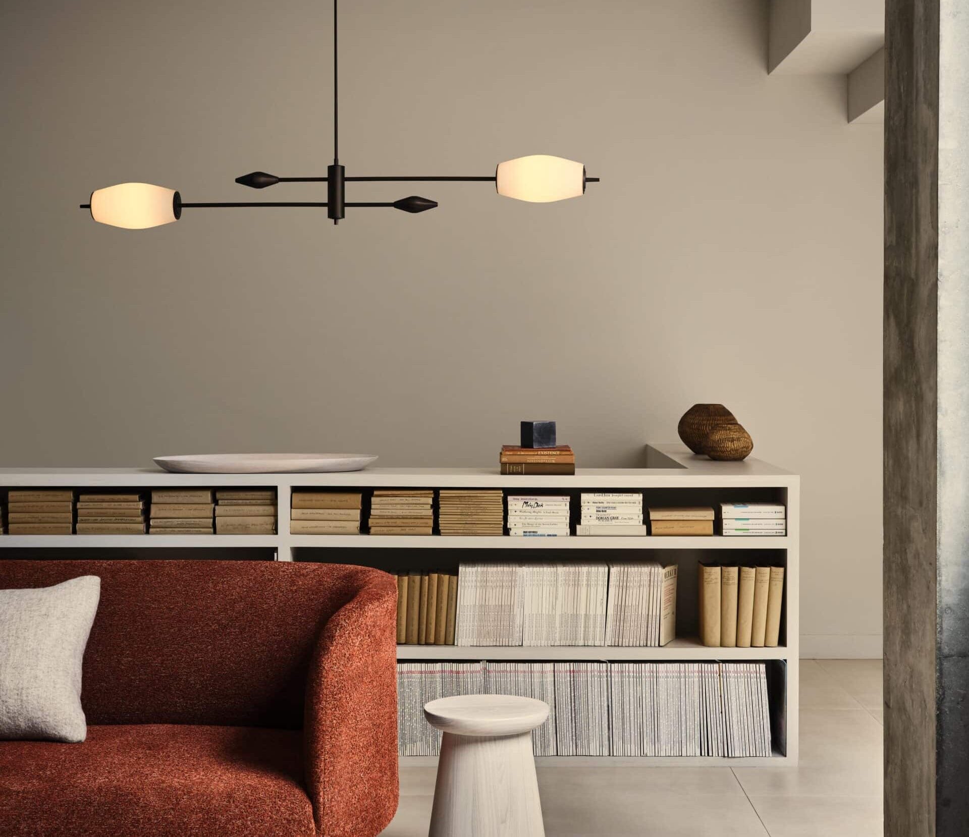 The 2-arm version takes a linear form that sits perfectly over counters, desks, or long dining tables. Shown in our Bronze finish, which creates a bold graphic silhouette.